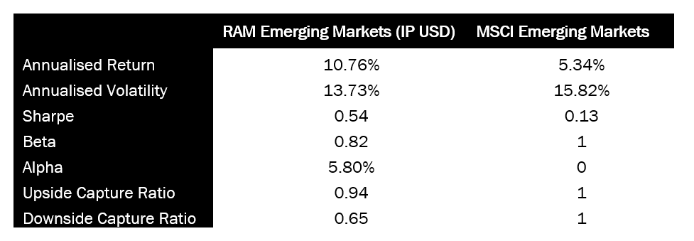 Au cours des 5 dernières années, la stratégie RAM Emerging Markets Equities a généré un rendement annualisé de 10,76 %, contre 5,34 % pour l'indice MSCI Emerging Markets. Cela a été réalisé avec une volatilité plus faible (13,73 % contre 15,82 %), résultant en un ratio de Sharpe de 0,54 contre 0,13 pour l'indice.