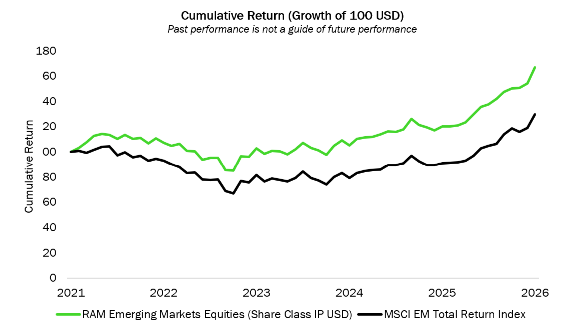 Ce biais qualité et value est de plus en plus pertinent alors que les leaders technologiques font face à une pression croissante sur leur génération de free cash-flows. Les programmes d'investissement massif, notamment dans l'infrastructure d'IA, ont conduit plusieurs entreprises de très grande capitalisation à émettre de la dette pour financer leurs investissements, soulevant des questions parmi les investisseurs sur les rendements futurs du capital. En revanche, le portefeuille RAM Emerging Markets Equities se concentre sur les entreprises ayant une allocation de capital disciplinée et des rendements de Free cash-flows robustes. En janvier 2026, le rendement en Free cash-flow du portefeuille s'élevait à près de 7,87 %, soit le double de celui de l'indice MSCI Emerging Markets, reflétant notre préférence pour les entreprises qui génèrent de la trésorerie plutôt que d'en consommer.