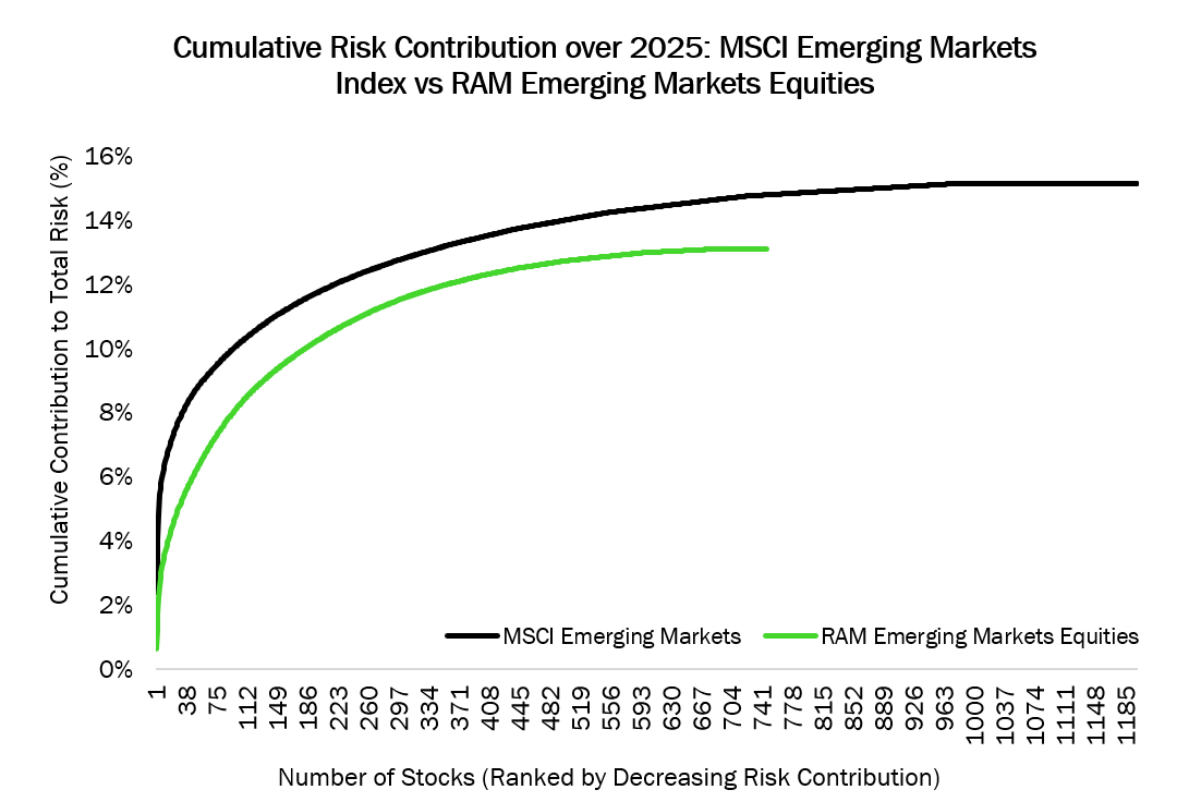 Le deuxième graphique illustre comment le risque s'accumule sur l’ensemble des positions du portefeuille. Dans l'indice MSCI Emerging Markets, le risque se construit rapidement avec les premières actions (courbe noire), reflétant une forte dépendance à un petit nombre de titres. En revanche, la stratégie RAM Emerging Markets Equities accumule le risque plus progressivement sur un ensemble plus large de positions (courbe verte plus plate), résultant en un profil de risque plus équilibré et diversifié.